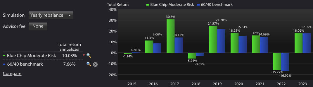 The metrics below show performance of the Blue Chip Moderate Risk portfolio compared to the 60/40 benchmark. Calculations are performed using Kwanti, a portfolio analytics software. While most of the ETFs included above have long performance histories, a few do not. In cases where a fund does not have a long performance history a proxy is used. For example, IBIT is a newly launched Bitcoin ETF which does not have much historical performance data. Thus, the total return of Bitcoin itself is used for periods before IBIT launched. Similarly, EMGF is a relatively new ETF which does not have a long history so performance data for the MSCI Emerging Markets index is used for periods before EMGF launched. Performance is inclusive of fees on all ETFs.