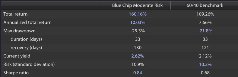 As shown in the analysis below, the Blue Chip Moderate risk portfolio has delivered an annualized return of 10.03% over the past 10 years compared to a 7.66% annualized total return delivered by a traditional 60/40 portfolio. While the outperformance is impressive, we must also consider the relative levels of risk. The Blue Chip Moderate risk portfolio has exhibited an annual standard deviation of 10.9% over the past 10 years compared to a 10.2% annual standard deviation realized by the 60/40 portfolio. Thus, the model portfolio has achieved significantly more return with just a modest amount of added risk and thus achieved a much better sharpe ratio.