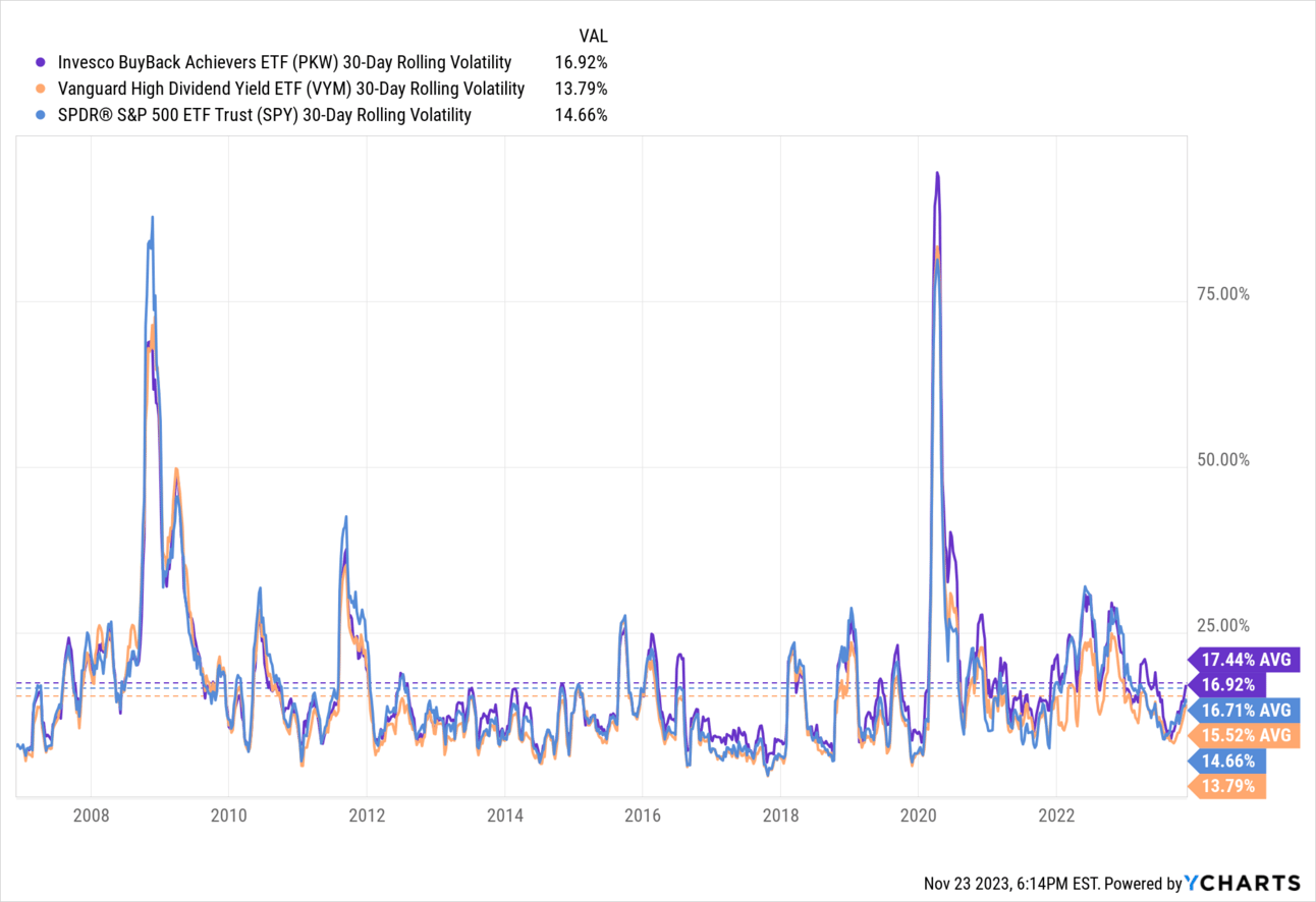 As shown by the chart below, PKW has significantly outperformed VYM since inception. However, PKW has done so with significantly more volatility. As shown by the chart below, since inception PKW has realized an average historical 30 day volatility of 17.4% compared to 15.5% for VYM and 16.7% for the S&P 500.
