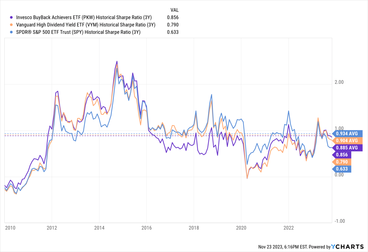 On a risk adjusted basis, PKW and VYM have performed almost the same with PKW realizing an average 3 year trailing sharpe ratio of 0.89 compared to 0.90 for VYM. The S&P 500 has realized a trailing sharpe ratio of 0.93 over the same time period.